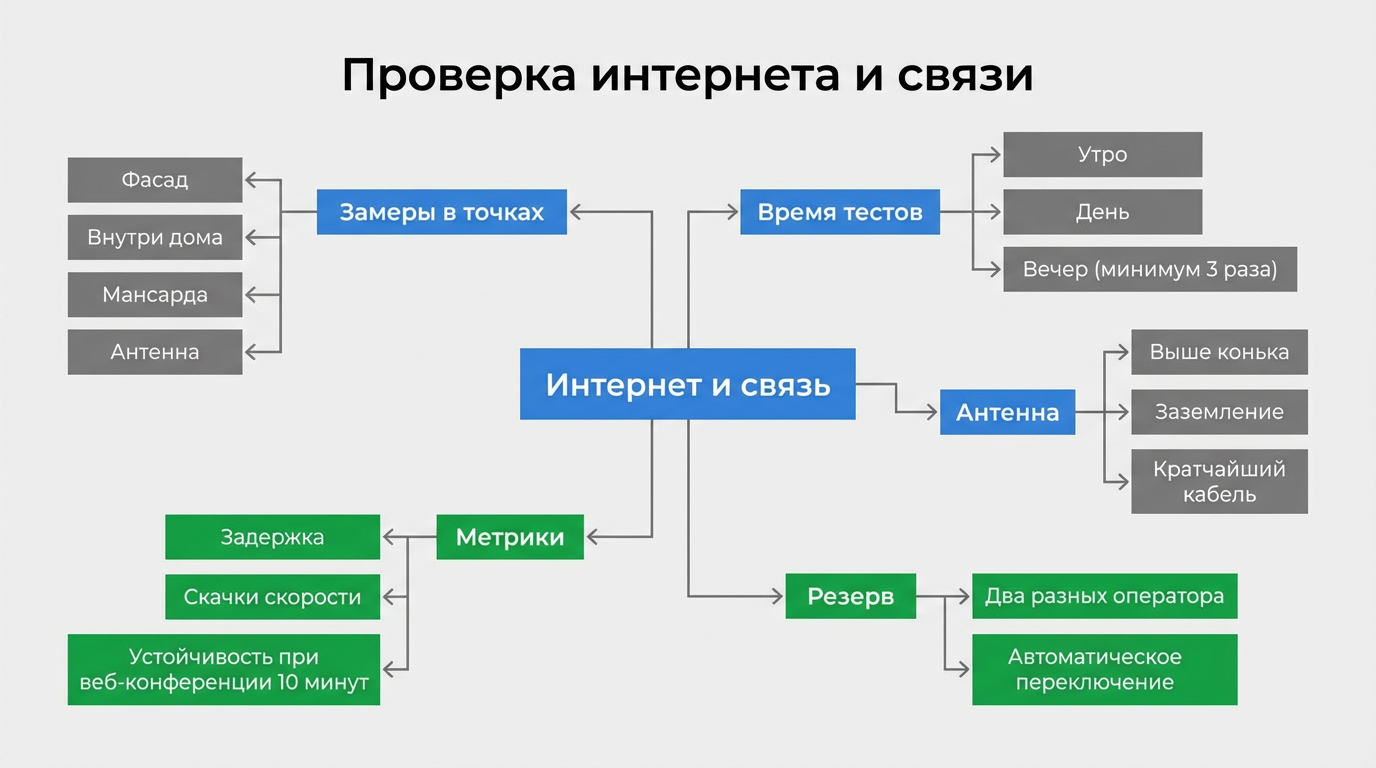 Измерения выполняются в нескольких местах участка: у фасада, внутри дома, на мансарде и в точке предполагаемой установки антенны. Каждый тест проводится минимум три раза: утром, днём и вечером, поскольку нагрузка на сеть плавает, а пиковые часы могут спрятать неприятные сюрпризы.